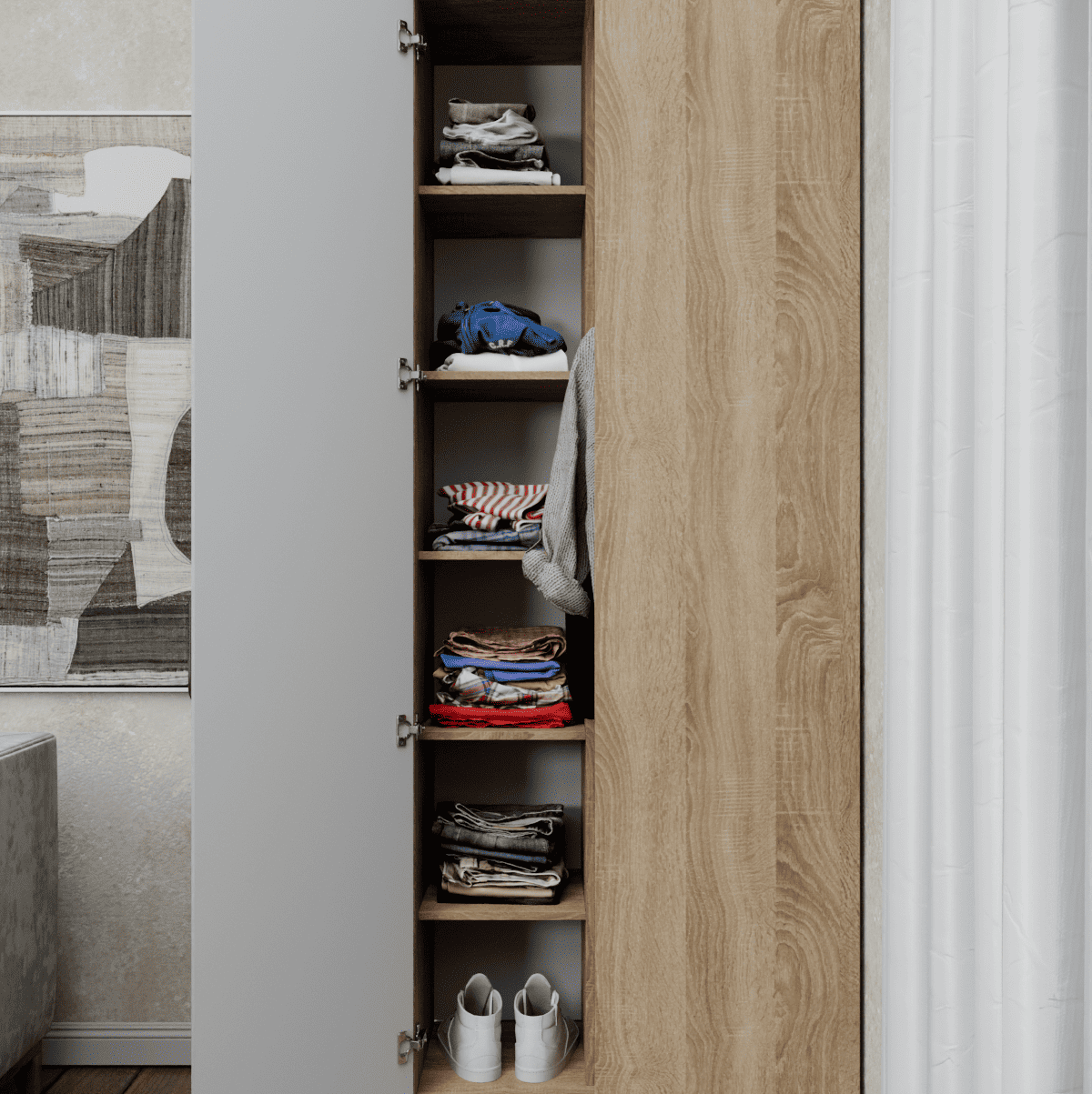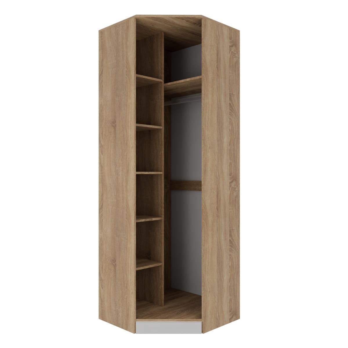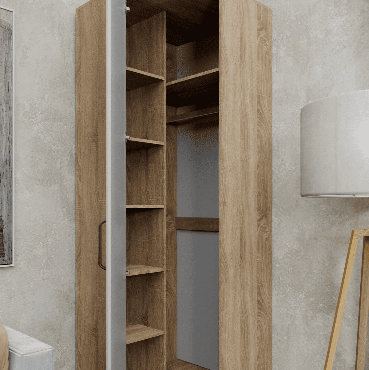 Практичный шкаф угловой ВЕНЕЦИЯ-1, выполненный в эффектном сочетании цветов дуб сонома/белое дерево, позволяет максимально эффективно использовать пространство, выступая как идеальный шкаф в прихожую или спальню. Модель объединяет в себе надежный корпус ЛДСП и стильный фасад МДФ, за которым скрывается продуманный и вместительный шкаф с полками и штангой. Это универсальный шкаф для одежды, который обеспечивает удобный доступ к вещам, а встроенное зеркало на створке не только помогает в ежедневных сборах, но и визуально расширяет помещение, добавляя интерьеру света и современного уюта.